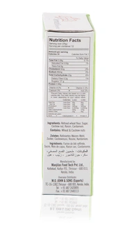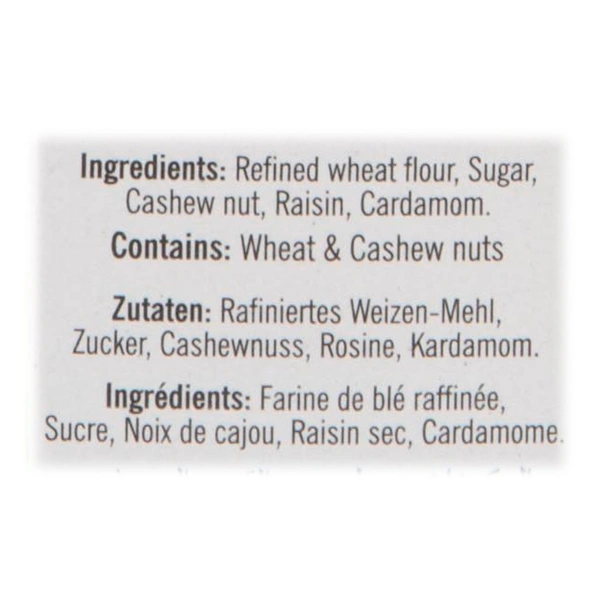 - Ingredients: Refined flour, sugar, cashew nut, raisins, cardamom